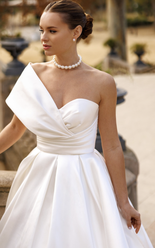 Tout en mikado, bustier avec bretelle asymétrique, légère et aérienne vous fait une belle taille de guêpe et une allure d'une élégance folle avec poches pour le petit côté moderne et pratique !