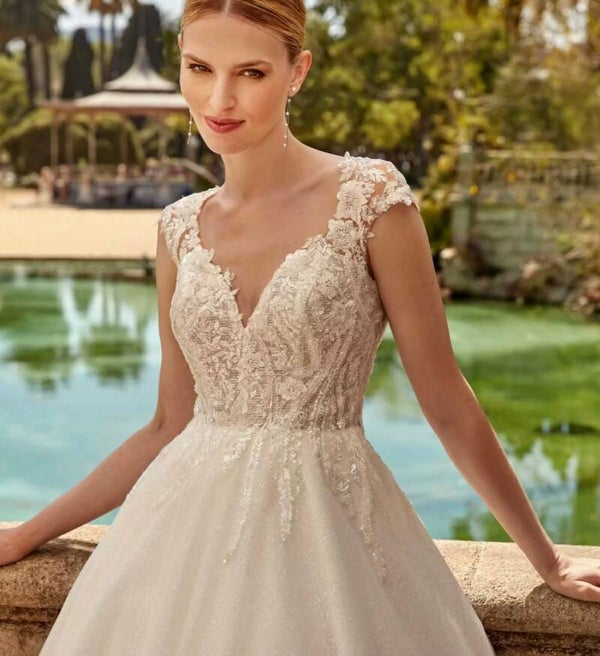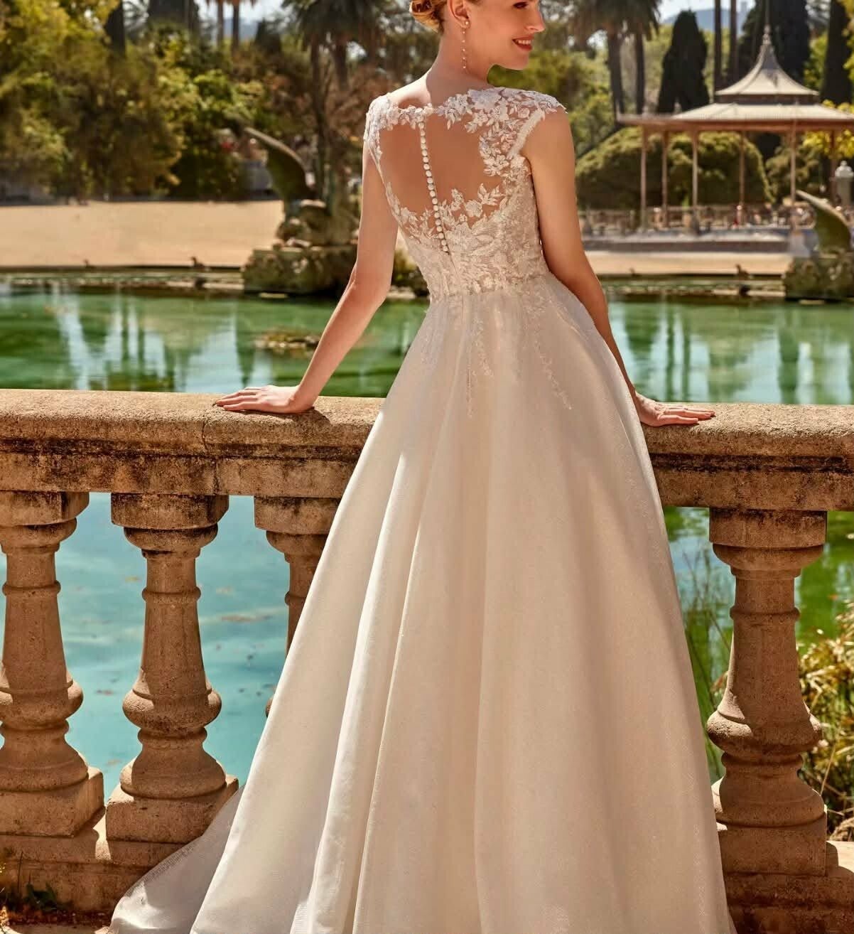 Modèle unique de raffinement et d'élégance, évasé avec un beau volume, plein de paillettes et une belle dentelle sur le corset, les hanches et le dos en transparence, Sybille oscille entre une couleur ivoire et champagne en fonction de la lumière.