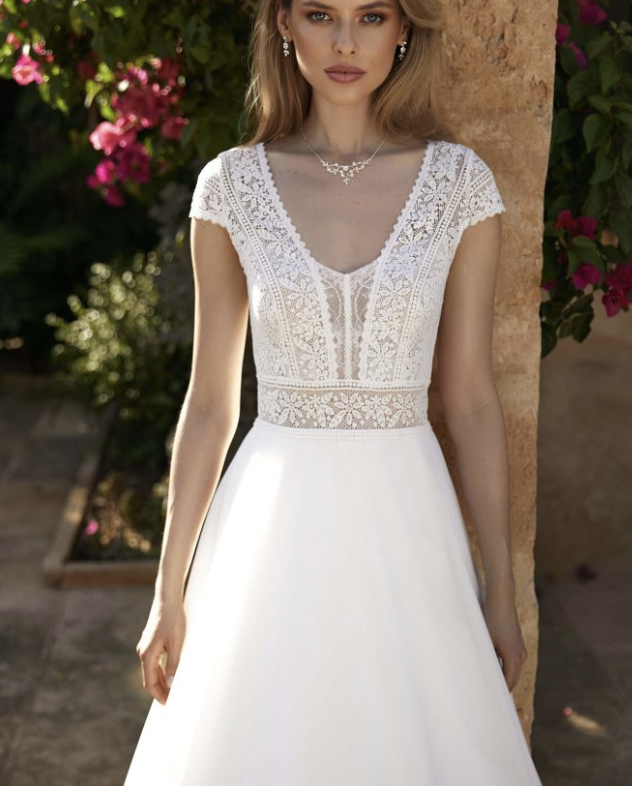 Robe de mariée trapèze pour une mariée bohème, romantique avec un petit côté rétro.