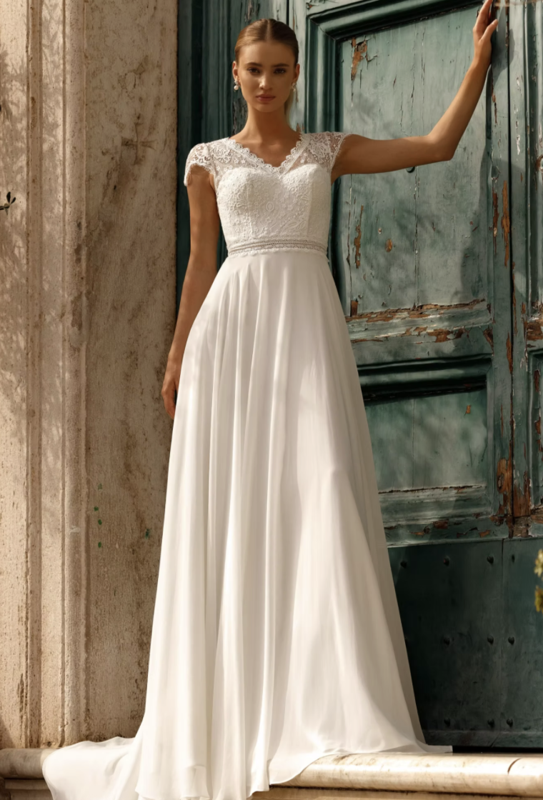 Évasée, fluide et légère avec dentelle fine au motif floral délicat au corset semi couvert avec petites manches courtes et décolleté en V.