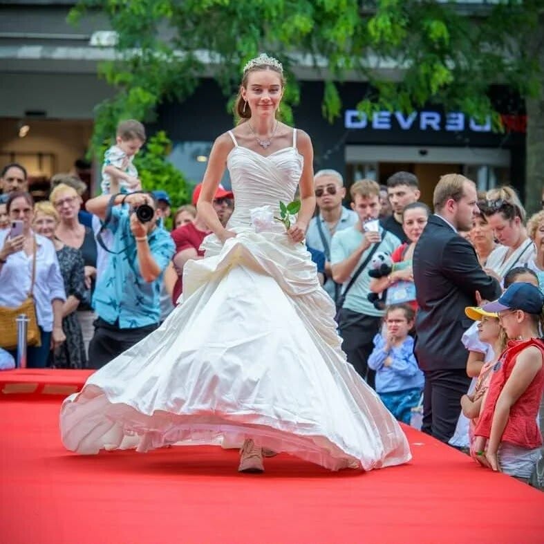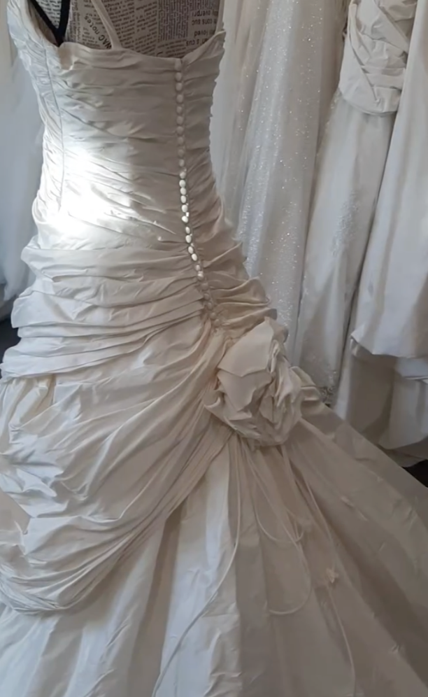 Style Bridgerton tout en satin de soie avec très beau volume et longue traine.