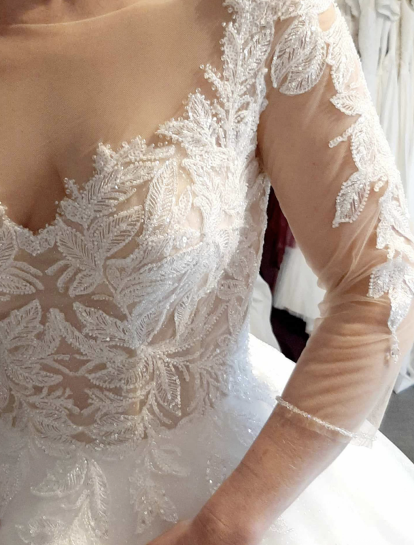 Dentelle perlée et sequins au corset avec effet de transparence et dentelle tatouage sur les bras.