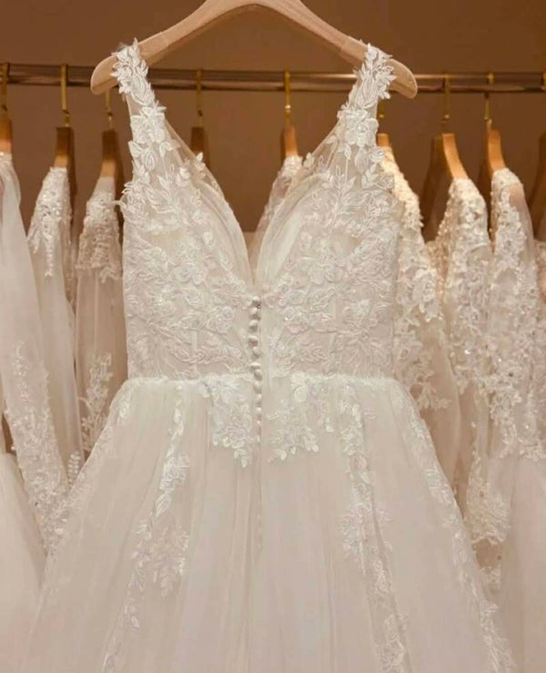 Sans manches avec traine ornée de dentelle.