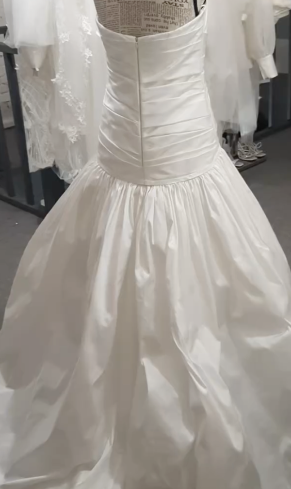 Robe blanche tout en satin plissé très couture.